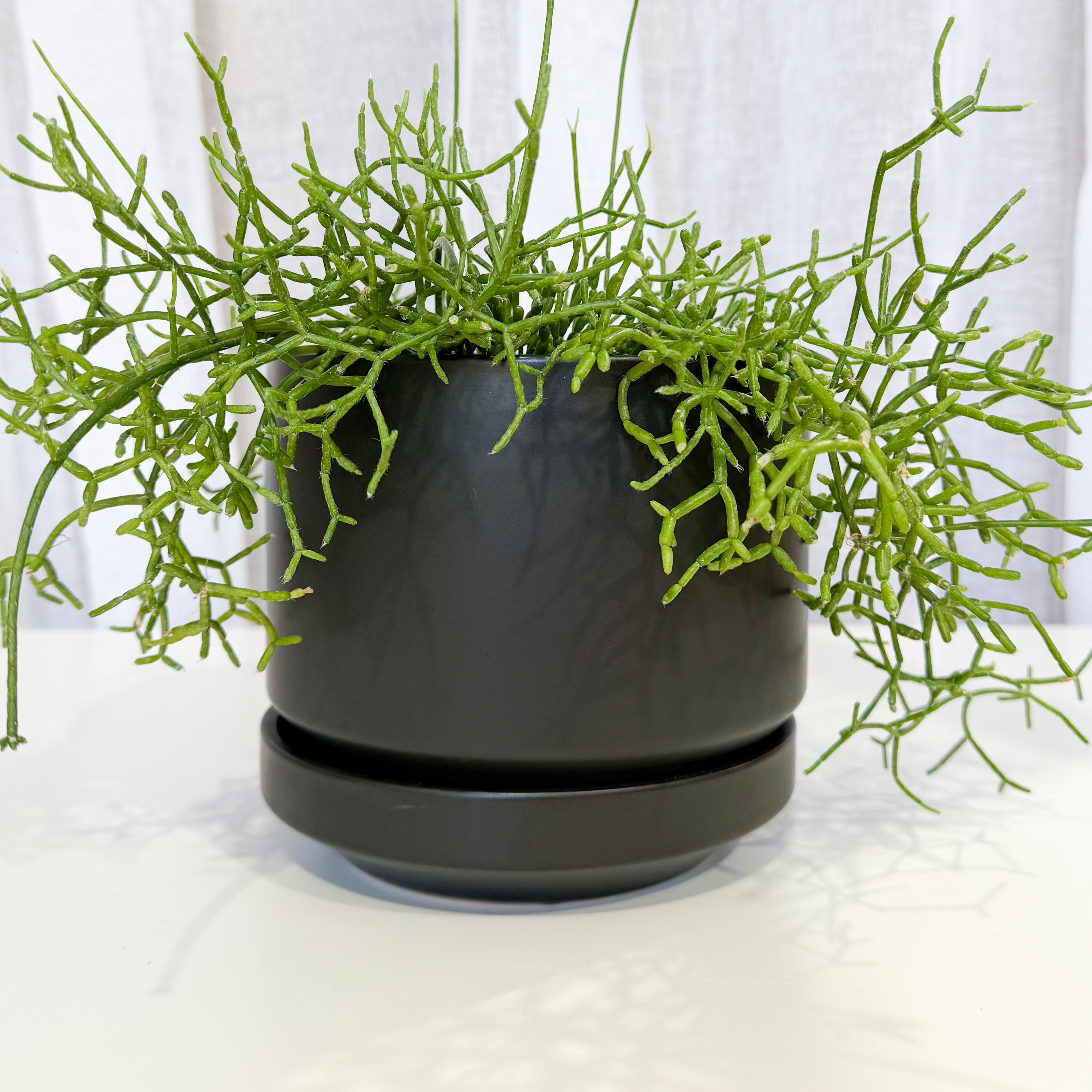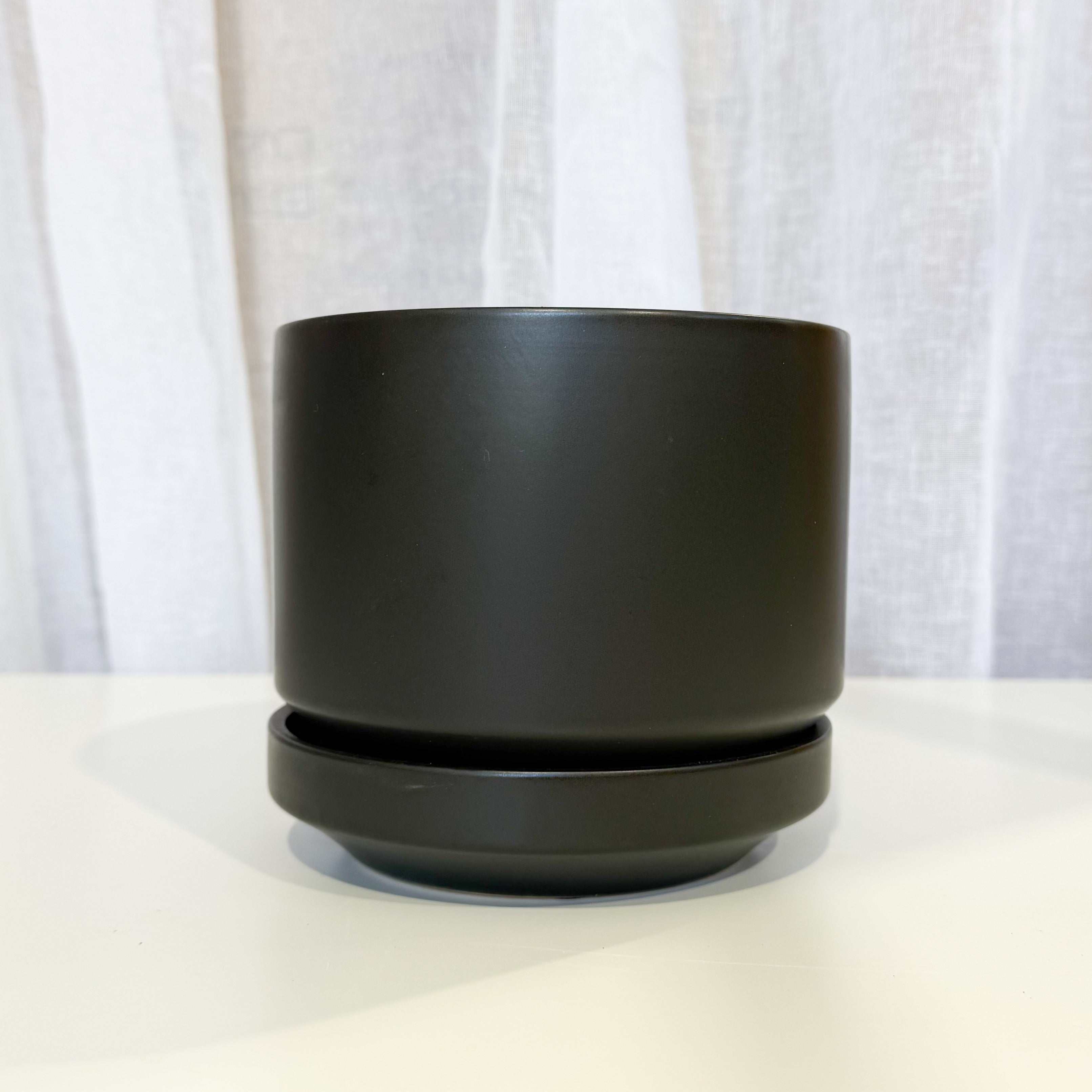 A stylish minimalistic pot with straight sides and a tapered base that sits neatly into a deep saucer. Has a hole for easy drainage.